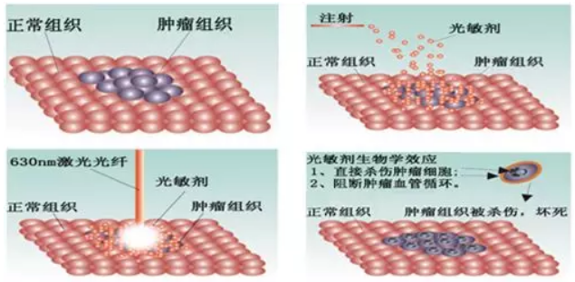 光敏劑可以濃聚于腫瘤組織中,在特定波長(zhǎng)的光照射下發(fā)生光化療反應(yīng),產(chǎn)生單態(tài)氧等物質(zhì),可以導(dǎo)致癌細(xì)胞壞死、凋亡,同時(shí)還可以破壞腫瘤的血管,從而達(dá)到治療腫瘤目的。