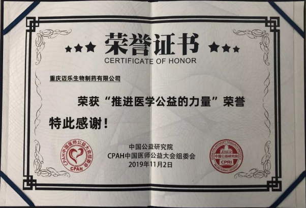 11 月 2 日,“2019首屆中國醫(yī)師公益大會”在江蘇省無錫市隆重舉行,重慶邁樂生物制藥有限公司受邀出席。為表彰邁樂生物在患者援助、慈善捐贈、學術推廣等公益方面的卓越貢獻,大會特向其頒發(fā)“推進醫(yī)學公益力量”榮譽獎項。